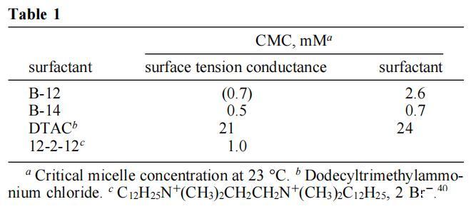 B-12和B-14確實是水溶性化合物,在臨界膠束濃度(CMC)以上形成膠束,動態(tài)光散射顯示顆粒大小小于5nm。CMC值是通過表面張力-濃度曲線(圖4)和電導率-濃度曲線(圖5)中的斷裂來確定的。38表1給出了結果數據(以及兩種常規(guī)表面活性劑的數據,用于比較)。如圖所示,B-12的CMC值通過張力測量法和電導測量法(這兩種方法都是可重復的)得出的結果不一致。這種差異至少部分可以追溯到B-12表面張力的時間依賴性。因此,在10分鐘的過程中,B-12水溶液的表面壓力增加了10 mN/m,之后趨于穩(wěn)定。這種動態(tài)表面張力過程(之前已經用雙子座表面活性劑觀察到)13,15,39可能與雙子座表面活性劑在空氣/水界面組織方面的困難有關。為了解決這個問題,圖4中的B-12溶液在表面張力測量之前老化20分鐘,從而減少了系統(tǒng)尚未平衡的可能性。盡管采取了這種預防措施,但我們無法確定依賴時間的界面重組是否不會影響B(tài)-12圖,并導致基于張量和電導的數據之間的差異。當然,后者來源于不受界面事件影響的大塊特性,因此更可靠。有趣的是,B-14沒有表現出隨時間變化的表面張力,兩種方法確定的CMC值是合理一致的。也許更長的鏈既增強了對空氣/水界面的親和力,也增強了從溶液中吸收界面的動力學。