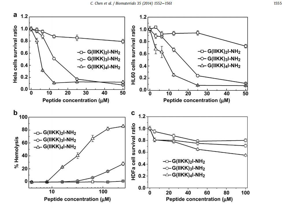一段時間以來,天然抗菌肽(AMPs)及其合成類似物一直被視為新抗生素的潛在來源。AMP對廣泛的微生物表現出不同的抗菌活性,有趣的是,其中一些還表現出對癌細胞的毒性,但對正常哺乳動物細胞的生物相容性程度不同[2e4]。此外,由于這些AMP主要通過非受體介導的途徑作用于靶細胞膜,與傳統化療藥物相比,癌細胞更難產生耐藥性[3,4]。由于這些理想的特性,研究和開發(fā)具有癌細胞毒性的AMPs可能會在開發(fā)更好的抗癌藥物方面取得進一步進展。短的線性陽離子AMP在與其靶相互作用時折疊成兩親構象,代表了抗菌肽的一種特別成功的結構安排[5e7]。為了提高其在治療應用中的前景,并研究結構活性關系,已經設計和合成了許多類似物,以模擬天然AMPs的特征,并有不同的成功報道。主要障礙在于調整針對宿主細胞的毒性的效力。