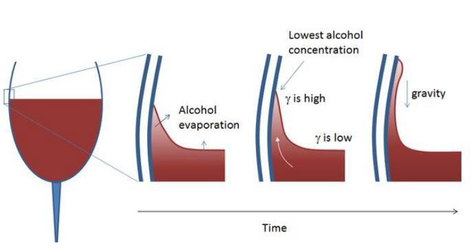 水由于強有力的氫鍵的存在,使得其表面張力極強。正是由于表面張力的存在,因此葡萄酒和杯壁交界處有一個薄薄的彎月面,它的存在加上表面乙醇的蒸發(fā),使得此處水的占比較大,因此具有較大的表面張力。而酒內(nèi)部的乙醇濃度較高,表面張力較小,因此與彎月面處形成了一個表面張力梯度,從而內(nèi)部的酒逐漸向彎月面移動,彎月面處的酒逐漸變多,逐步形成一個個小酒滴。但當酒滴大到一定程度時,由于重力作用,它便會滴下來,這就是“酒淚”現(xiàn)象了。