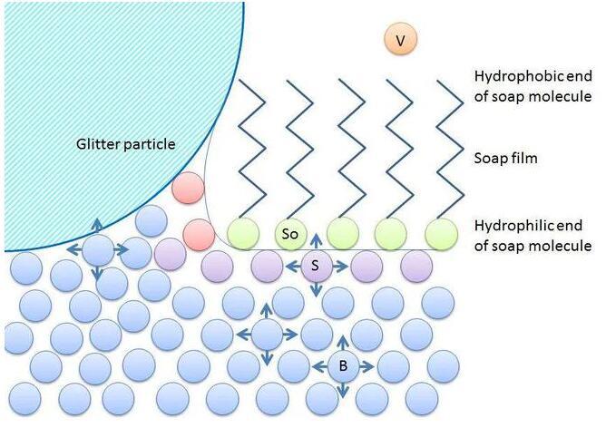 而水和乙醇的比例直接使得液體的表面張力發(fā)生了變化。液體的表面張力是由于表層的液體分子之間的作用力遠大于液體-空氣的吸引力所導致。而表層的水分子之間的吸引力使得水與空氣的交界面具有收縮的吸力,這就表現(xiàn)為了液體的表面張力。