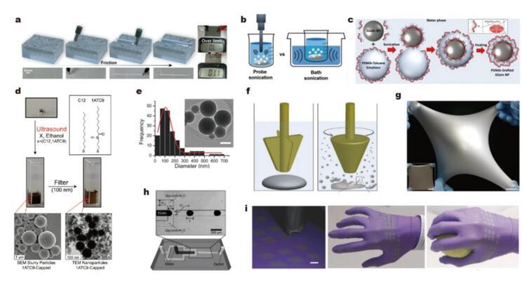 使用超聲和剪切等自上而下的方法將液態(tài)金屬?gòu)囊粋€(gè)大的液滴分割成許多微米級(jí)或納米級(jí)的液滴,并保證其粒度分布相對(duì)均勻。氧化層或其他人工形成的表面修飾將暫時(shí)阻止液滴的重新結(jié)合。可拉伸電子設(shè)備的圖案可以通過(guò)排列這些液滴來(lái)繪制,這相當(dāng)于通過(guò)減小粒徑以增加比表面積(增加氧化層比例)進(jìn)而降低表面張力。