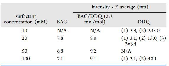 光子相關(guān)光譜(PCS)用于測定膠束的流體動力學(xué)直徑。BAC和BAQ/DDQ 2:3 mol/mol的PCS分布圖(圖1b)顯示了在相關(guān)濃度范圍內(nèi)的單峰分布,平均Z平均值和單峰分布表明存在橢球或球形膠束幾何結(jié)構(gòu)。DDQ呈現(xiàn)雙峰/三峰分布,表明膠束結(jié)構(gòu)具有較大的聚集數(shù)(表4)。這可以用具有徑向長度和軸向長度的圓柱形幾何體或與單分子或多分子囊泡平衡的球形膠束來解釋。28這兩種情況與早期DDQ熒光探針研究的結(jié)果一致,該研究觀察到膠束聚集數(shù)從20增加到86,濃度從10增加到81 mM。29