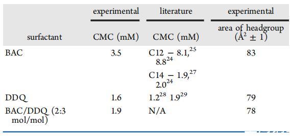 表3:??諝庵蠦AC、DDQ和BAC/DDQ 2:3 mol/mol的表列CMC和每人頭群表面積值?25°C時的水界面