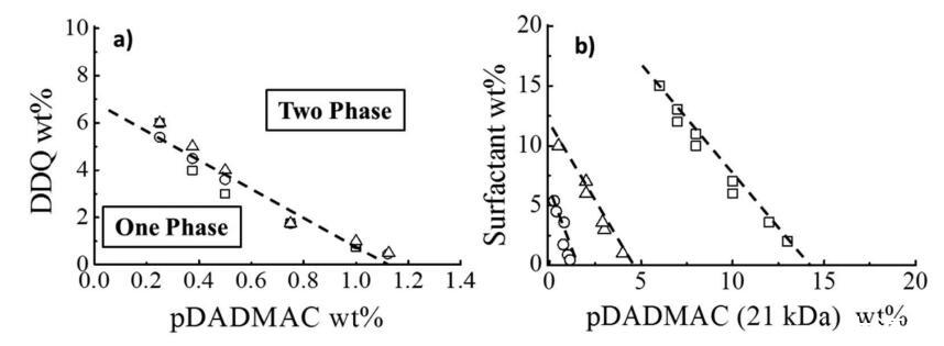 圖4:。(a)pDADMAC/DDQ/水的相分離邊界作為pDADMAC分子量的函數(shù):(□)8.5 kDa(○)21 kDa和(Δ)140 kDa(25°C時)。(b)pDADMAC的相分離邊界(21 kDa)/表面活性劑/水(○)DDQ(□)25°C下的BAC和(Δ)BAC/DDQ(2:3 mol/mol)。虛線表示相界的大致位置。