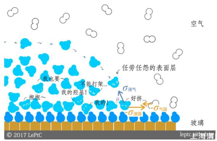 在氣體和液體之外,現(xiàn)在我們再加入新的角色——固體表面。玻璃的表面對水分子非常有吸引力(雖然玻璃的主要成分是二氧化硅,但它的表面通常會因為價態(tài)不飽和而結(jié)合很多羥基)。如果水滴碰到的界面是玻璃,就會出現(xiàn)跟空氣相反的情況:接觸面的水分子比平衡時更擠,表面張力是擴張的,表面能是負的,整坨水滴會希望自己跟玻璃的接觸面積越大越好(同時跟空氣接觸面積越小越好),形成特定的接觸角θ。這個角越小,意味著固體表面的親水性越強。