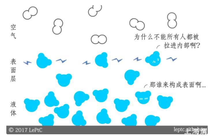 假設(shè)上下兩部分的壓強相同(壓強不同的情況將在第二節(jié)介紹),由于空氣對水分子的吸引力小于水分子之間的吸引力,所以位于表面的水分子會受到指向液體內(nèi)部的力,一部分水分子被拉進液體內(nèi)部,表面層的水分子開始變稀疏,直到吸引力減弱到和空氣接近時趨于平衡。表面層水分子的間距大于r0,因此吸引力占上風(fēng):