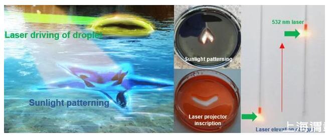 研究中,王志明團(tuán)隊也展示了一些基本應(yīng)用示例,比如借助激光和日光可以在液體表面雕刻圖形,還可讓激光搬運液體,讓激光驅(qū)動毛細(xì)管中的液體,讓激光驅(qū)動液體表面液滴、甚至驅(qū)動不同液滴發(fā)生化學(xué)反應(yīng)的應(yīng)用。