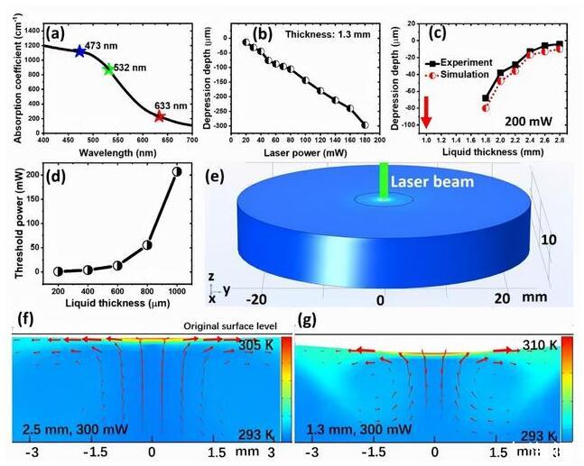 為了探索該光致液體宏觀形變的機(jī)理,王志明團(tuán)隊通過COMSOL(Comsol Multiphysics,多物理場)仿真,首次系統(tǒng)性地研究了影響光致液體下凹形變的多個物理參數(shù),并優(yōu)化了液體最大形變的條件。