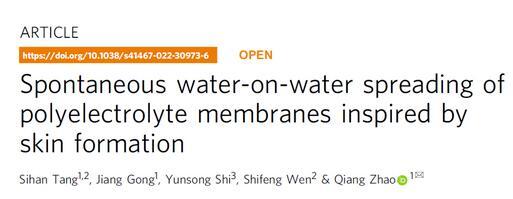 近期,趙強教授課題組在《Nature Communications》在線刊發(fā)了該領(lǐng)域的新進展(Spontaneous water-on-water spreading of polyelectrolyte membranes inspired by skin formation,Nat.Commun.13,3227,2022.),提出了一種聚電解質(zhì)水溶液在水面自發(fā)鋪展,形成多孔膜的機制。文章第一作者是化學與化工學院2020屆碩士畢業(yè)生湯思晗,合作單位包括華中科技大學材料科學與工程學院,協(xié)和醫(yī)院。研究得到國家自然科學基金,國家重點研發(fā)計劃和三峽實驗室開放基金的支持。
