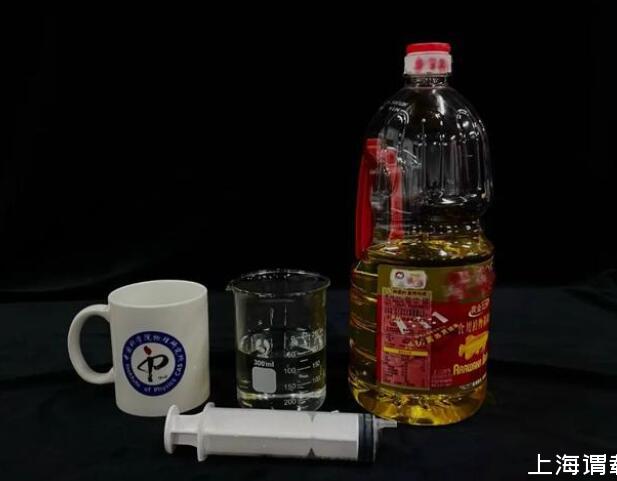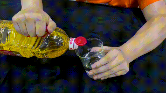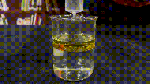 首先,我們沿杯壁向盛有水的燒杯中加入食用油,使水油有一個(gè)干凈的界面