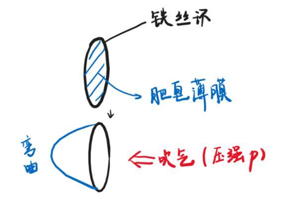 這時(shí),咱們?cè)谝粋?cè)吹氣(相當(dāng)于施加了一個(gè)壓強(qiáng)),平整的薄膜就發(fā)生“彎曲”——