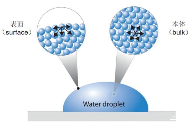 但是,表面的出現(xiàn),使得一些分子變得不同,它們的外側(cè)是氣體或真空,幾乎沒(méi)有作用力,這使得表面上的分子“很不安分”,產(chǎn)生了額外的能量——表面能。
