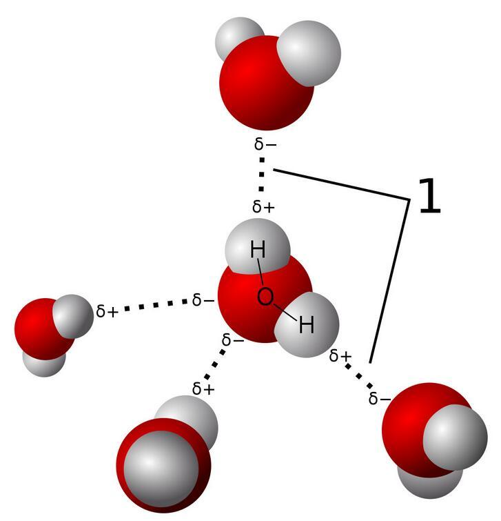 水由氫和氧原子組成。當(dāng)氫(H)原子與氧(O)、氮(N)或氟(F)結(jié)合時,氫唯一的一個電子會與它們形成共價鍵,這時候氫原子的電子由于被O、N或F吸引而稍稍“跑偏”,導(dǎo)致氫原子這一端呈現(xiàn)更多的正電性(氫原子核帶正電);與之相對應(yīng)地,分子的另一端會因為吸引電子的能力更強(qiáng)而顯示出負(fù)電。分子對外顯示出比較強(qiáng)的電極性,分子與分子之間會因為電極性的不同而相互吸引。
