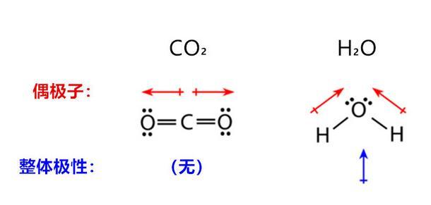 如果分子是由兩個以上原子組成,在確定分子是極性還是非極性時,還必須考慮分子的幾何形狀。下圖顯示了二氧化碳分子與水分子之間的比較,二氧化碳是線性分子,偶極子因強(qiáng)度相同方向相反而互相抵消,對外顯示整體分子的極性為零;水分子的兩個極性鍵有夾角,因此整體對外顯示出極性。
