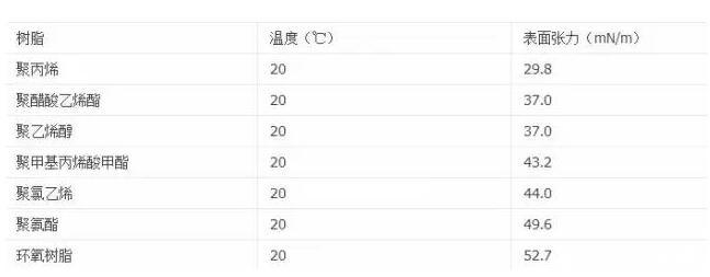 由于高分子沒有氣態(tài),即樹脂氣相的蒸氣壓為零。因此,與液態(tài)樹脂共存的只有氣相。固體樹脂表面張力的測定有很大的困難,因此,固體的表面張力一般是通過間接方法進(jìn)行測定的,對于涂層而可以先測定樹脂熔體的表面張力,再根據(jù)表面張力與溫度的關(guān)系進(jìn)行外推。表1列出了一些樹脂從液態(tài)外推至固體時(shí)的表面張力值。