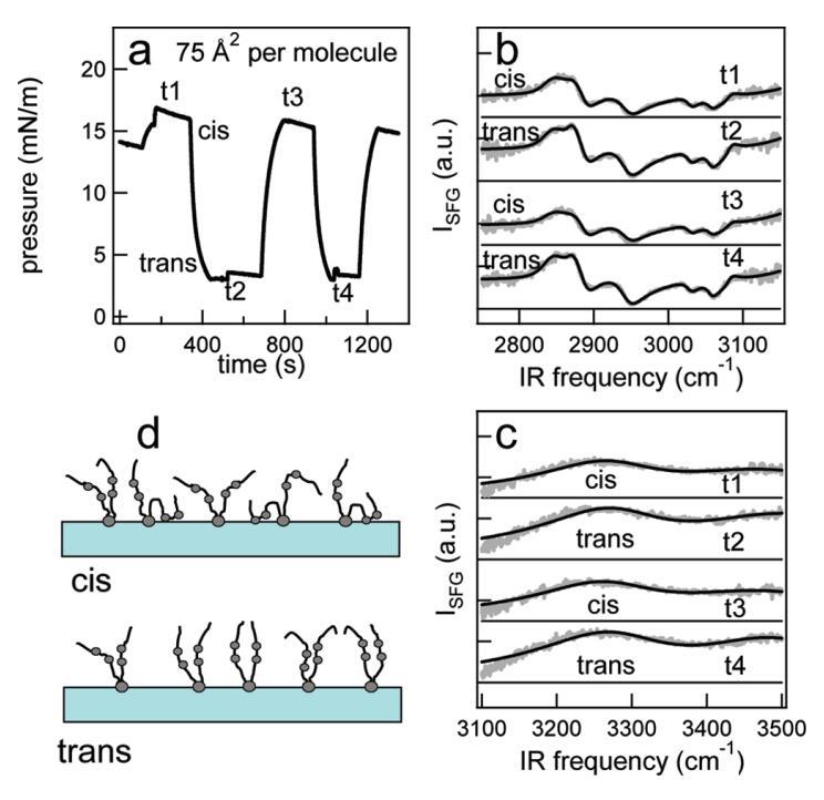 圖4:(a)在每分子75?2的面積處,脂質(zhì)/H2O界面處的光開關(guān)脂質(zhì)的表面壓力作為時間的函數(shù)。370和450 nm光照射~100秒分別產(chǎn)生cis(高壓)和trans(低壓)狀態(tài)。壓力的微小劇烈波動是由于樣品高度的變化,以校正水的蒸發(fā)。(b和c)CH和OH區(qū)域(灰色)中相應(yīng)的VSFG光譜,以及洛倫茲線形狀模型的擬合(見正文)。為了清晰起見,對光譜進行了偏移。t1至t4對應(yīng)于面板a中進行光譜測量的時間。(d)脂質(zhì)尾部方向示意圖。光開關(guān)脂質(zhì)的偶氮苯部分用灰色圓圈表示。