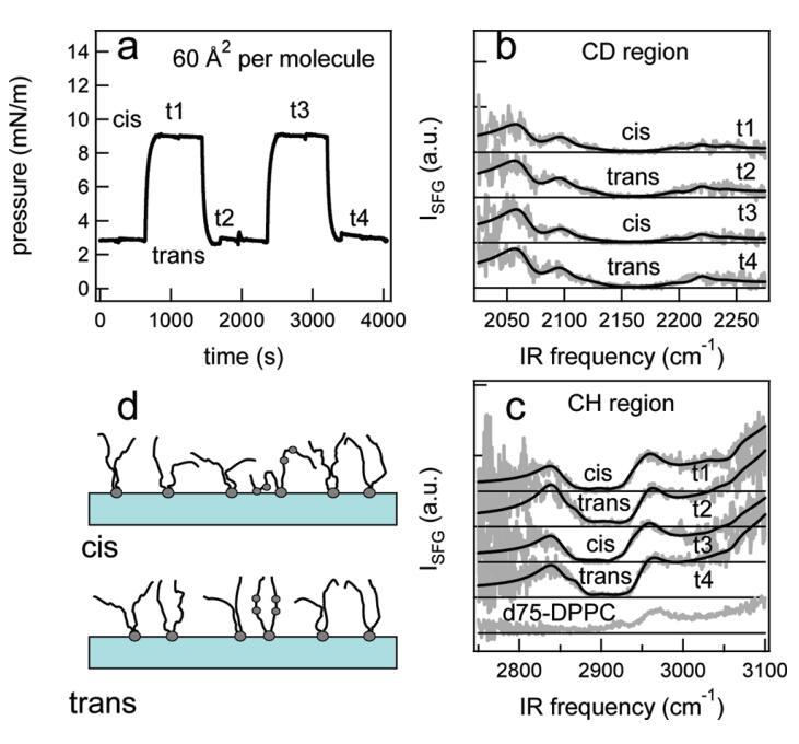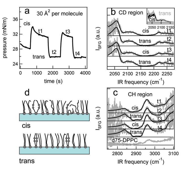圖7:。結(jié)果:對于1:5的DT Azo-5P/d75 DPPC混合物,在脂質(zhì)/水界面上,每個分子的面積為30?2。(a)表面壓力與時間的關(guān)系。370和450 nm光照射~100秒分別產(chǎn)生cis(高壓)和trans(低壓)狀態(tài)。壓力的微小劇烈波動是由于樣品高度的變化,以校正水的蒸發(fā)。順式狀態(tài)下表面壓力的降低可能是由于單層的松弛或膠束或囊泡的形成減少了表面的脂質(zhì)量。(b)相應(yīng)的VSFG光譜(灰色)以及CD區(qū)域的擬合。為了清晰起見,對光譜進行了偏移。插圖顯示了相互重疊的反式和順式光譜,以強調(diào)差異。(c)VSFG光譜(灰色)與fits一起引導(dǎo)眼睛進入CH區(qū)域。底部曲線顯示了P下純d75 DPPC的光譜~40 mN/m.(d)脂尾方向示意圖。光開關(guān)脂質(zhì)的偶氮苯部分用灰色圓圈表示。