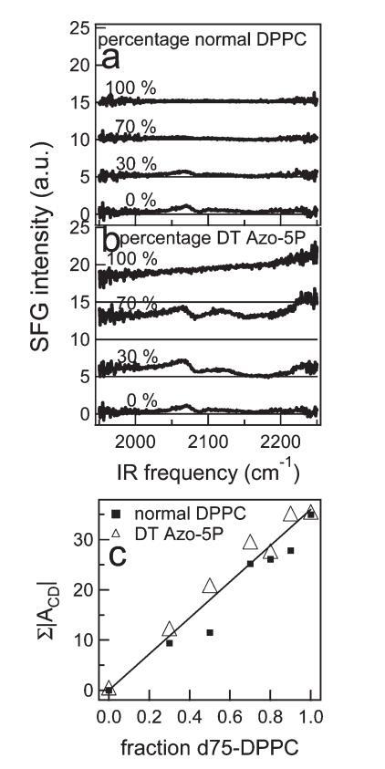 圖9:。(a)正常DPPC和d75 DPPC不同混合物的CD區(qū)VSFG光譜。圖中給出了混合物中正常DPPC的百分比。為清晰起見,光譜偏移,細(xì)線表示零。(b)與a部分類似,但適用于DT Azo-5P與d75 DPPC的混合物。(c)通過擬合VSFG光譜獲得的CD振動振幅之和,如文中所述,作為含正常DPPC或DT Azo-5P的二元混合物中分?jǐn)?shù)d75 DPPC的函數(shù)。在本實驗中,為了獲得混合物的高質(zhì)量數(shù)據(jù),紅外注量很高,導(dǎo)致通過VSFG光譜中相對較高的CH2和CD2振幅觀察到的脂質(zhì)尾部出現(xiàn)小的無序。
