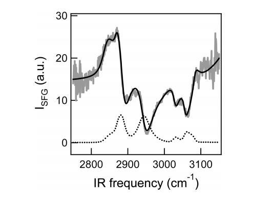 圖3:。在密度為75?2/分子和壓力為~3 mN/m。共振信號疊加在大型非共振背景上,由于共振信號和非共振信號之間的干擾,導(dǎo)致色散線型。黑色虛線表示NR振幅設(shè)置為零時的DT Azo-5P信號。