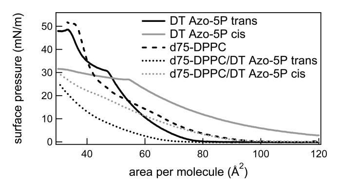圖2:反式和順式狀態(tài)下的光開關(guān)脂質(zhì)DT Azo-5P的表面壓力與面積等溫線(實線),d75-DPPC的表面壓力與面積等溫線(虛線),以及光開關(guān)兩種狀態(tài)下的1:5摩爾比的光開關(guān)脂質(zhì)與d75 DPPC的表面壓力與面積等溫線(虛線)。