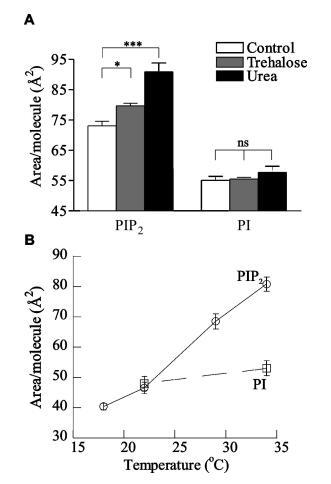 非離子液晶和溫度的膨脹效應(yīng)。為了驗證單價鹽破壞PIP2頭基之間有吸引力的氫鍵相互作用的假設(shè),部分克服了高頭基電荷密度預(yù)期的靜電排斥作用,測試了幾種非離子超嗜性因子破壞這些假定網(wǎng)絡(luò)和誘導(dǎo)單層膨脹的能力。尿素是一種因其潮向性而常用的蛋白質(zhì)變性劑,海藻糖是一種非還原性葡萄糖二聚體,因其破壞水結(jié)構(gòu)的能力而具有低溫保護特性,對其對PIP2單層的影響進行了測試。與通過氫鍵的吸引相互作用相一致,兩種非離子超取向?qū)畏肿幽ざ加泻軓姷呐蛎浶?yīng)。在π)30 mN/m時,5 m尿素使每個PIP2分子的面積增加了近25%,達到90.9?2/分子,這是在這些實驗中所采用的任何條件下觀察到的最高值(圖4b)。同樣,5 mM海藻糖顯著增加PIP2單層的面積9%。這些作用對PIP2有特異性,因為兩種處理對PI的單層都沒有顯著影響。