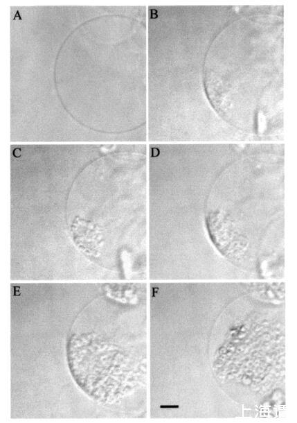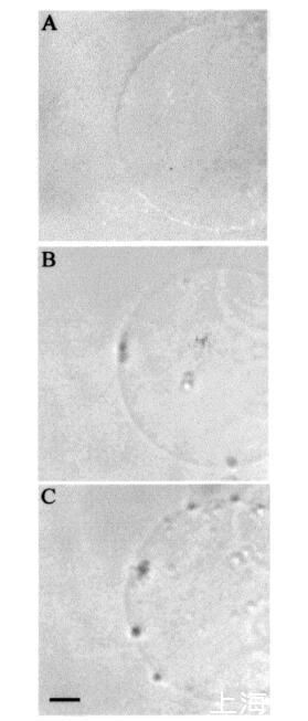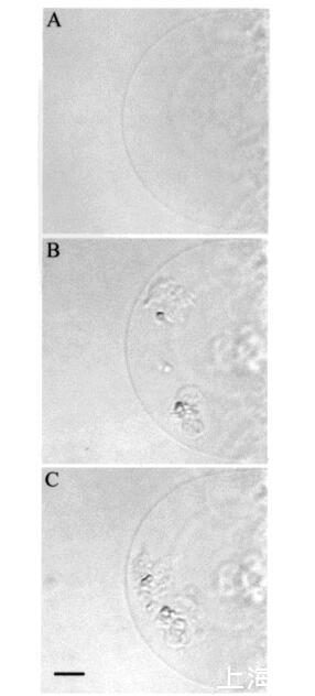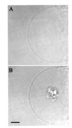 圖9:HMC圖像序列,說明了在添加肽之前(圖a)和應用肽后立即通過temporin L.巨大囊泡轉(zhuǎn)化SOPC/膽固醇(Xchol)0.10)巨大脂質(zhì)體≈0.24 fmol的temporin L(面板B)。面板B中比例尺的長度對應于50μm。