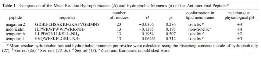 我們的長期目標是建立最低的序列要求,這可以進一步作為設計新型抗菌肽類似物的指導原則。我們之前已經(jīng)比較了兩種抗菌肽,馬蓋寧2和吲哚肽對本研究中使用的相同模型膜系統(tǒng)的影響,即。,單層、脂質(zhì)體和巨大囊泡(15)。我們早期研究中使用的肽是選擇的,因為它們代表兩種不同類型的抗菌肽家族。在本研究中,我們使用了兩種13個氨基酸的肽,即與吲哚肽長度相似的肽。肽的結(jié)構(gòu)參數(shù)不同,如電荷、構(gòu)象、疏水性、疏水力矩和大小(表1)。有趣的是,在所研究的四種肽中,以摩爾為基礎計算的時間蛋白L最有效,作用于中性和酸性磷脂膜。與其他三種肽相比,其凈陽離子電荷和疏水性具有平均值(表1)。然而,在所示的肽中,temporin L具有最高的平均疏水力矩,這表明這可能是與其有效的膜擾動作用相關的一個重要參數(shù),這與之前比較magainin 2和其他抗菌肽的研究一致(31)。