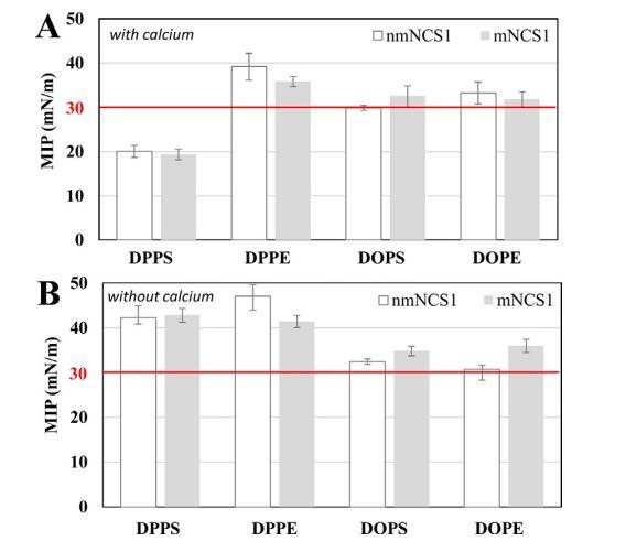 圖6.nmNCS1(白色)和mNCS1(灰色)的MIP值,在不存在鈣(A)和存在鈣(B)的情況下,具有DPPS、DPPE、DOPS和DOPE。MIP值的不確定性如第2.3節(jié)所述計(jì)算。