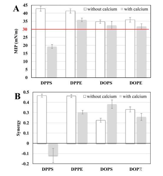 圖7.在鈣存在下,使用DPP、DSP、DOPS、DDPS、DPPC、DSPC、DOPC、DOPC、DDPC、DPPE、DSPE、DOPE、DOPE和DDPE的單層的N-末端肽的MIP(A)和協(xié)同作用(B)值。MIP和synergy值的不確定性如第2.3節(jié)所述計(jì)算。