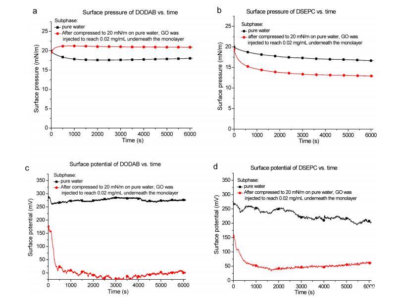 圖2:(a)DODAB和(b)DSEPC單層的表面壓力與經(jīng)過時間。(c)DODAB和(d)DSEPC單層的表面電位與經(jīng)過時間的關(guān)系。黑色曲線:在純水亞相上將單層壓縮至20 mN/m的表面壓力。紅色曲線:將單層壓縮至20 mN/m后,小心地將600μL 1 mg/mL GO分散液緩慢注入單層下方的水亞相中,使GO達到0.02 mg/mL。