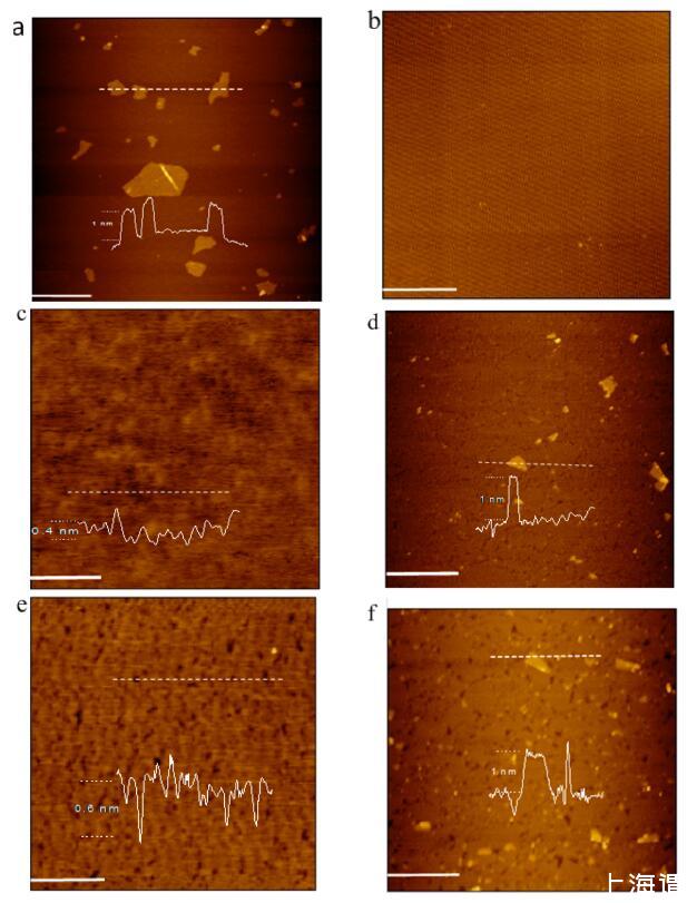 圖5.新切割云母表面上的AFM圖像(比例尺=1μm):(a)干燥后的一滴GO分散液;(b)LB膜在空氣中不沉積脂質(zhì)的對照實驗?GO-水界面;(c)從空氣中轉(zhuǎn)移的DODAB LB膜?純水界面;(d)從空氣中轉(zhuǎn)移的DODAB LB膜?GO-水界面;(e)從空氣中轉(zhuǎn)移的DSEPC的LB膜?純水界面;(f)從空氣中轉(zhuǎn)移的DSEPC的LB膜?轉(zhuǎn)到水界面。所有脂質(zhì)LB膜在20 mN/m的恒定表面壓力下轉(zhuǎn)移。