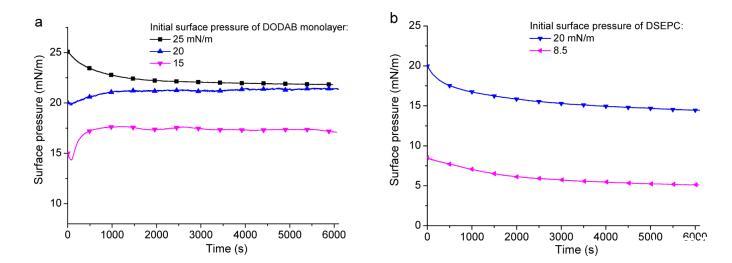 圖4.GO在不同表面壓力下對(a)DODAB和(b)DSEPC單層的吸附研究(表面壓力與經(jīng)過時間的關(guān)系)。首先將單層壓縮至純水亞相上的一定表面壓力,然后小心地將600μL 1 mg/mL GO分散液緩慢注入單層下方的水亞相。