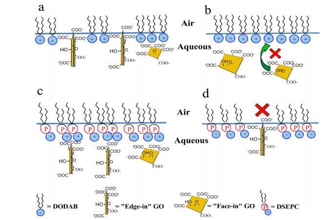 圖3.GO在空氣中并入DODAB(a,b)和DSEPC(c,d)單層時可能的方向示意圖?水界面。