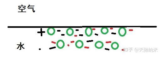 但是問題來了。水面的這一排分子,上面沒有水分子了。于是對(duì)著空氣的這一面,電荷沒有辦法被抵消了。于是電荷就開始亂七八糟了。但是整體上還是平衡的。