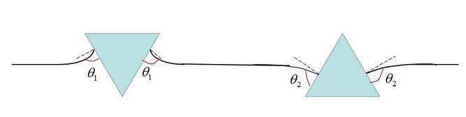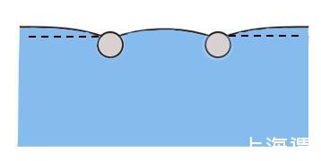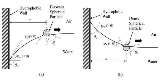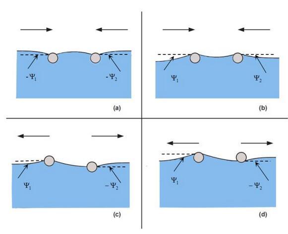 上圖便是水上兩個(gè)漂浮小球的吸引與排斥的判斷方法。值得注意的是,我們這里并沒(méi)有提及小球的浸潤(rùn)性,也就是說(shuō),浸潤(rùn)性與橫向毛細(xì)力的性質(zhì)并不直接相關(guān)。實(shí)際上,橫向毛細(xì)力還可以分為漂浮橫向毛細(xì)力和浸沒(méi)橫向毛細(xì)力。我們討論的情況是漂浮橫向毛細(xì)力,由小球的重力引起,題主的所說(shuō)的浸潤(rùn)性應(yīng)該換為小球的輕重(與水相比)。例如圖(a)里是兩個(gè)比水重的小球,表面張力將其往上拉。圖(b)是兩個(gè)比水輕的小球,表面張力將其往下拉。表面張力的方向恰好就對(duì)應(yīng)了前述接觸線處液面的傾斜角。題主的所要表達(dá)的意思其實(shí)是: