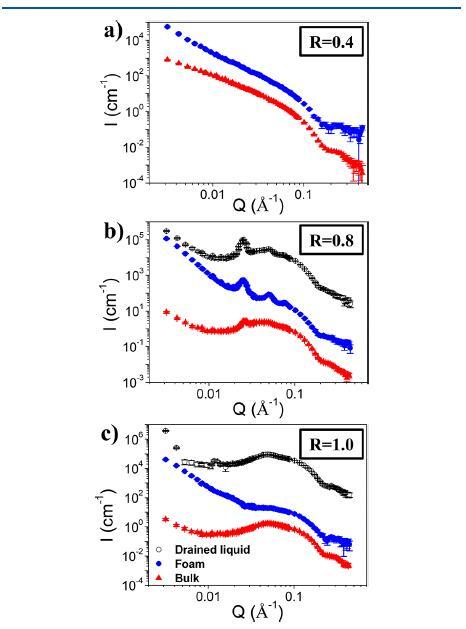 圖2:對于(a)R=0.4,(b)R=1.0和(c)R=2.0,散裝溶液(紅色三角形)、泡沫(藍(lán)色圓圈)和排出液體(黑色空圓圈)的SANS光譜。為清晰起見,將光譜強(qiáng)度相互偏移了100倍。