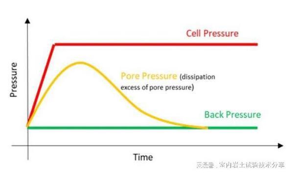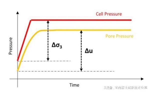 在此過(guò)程中,計(jì)算孔隙壓力系數(shù)B以確定飽和度。重復(fù)這些步驟,直到樣品飽和。大多數(shù)標(biāo)準(zhǔn)規(guī)定,大于0.95的B值表明標(biāo)本已充分飽和。B值計(jì)算為一個(gè)比值其中?u=孔壓變化?σ3=圍壓變化;