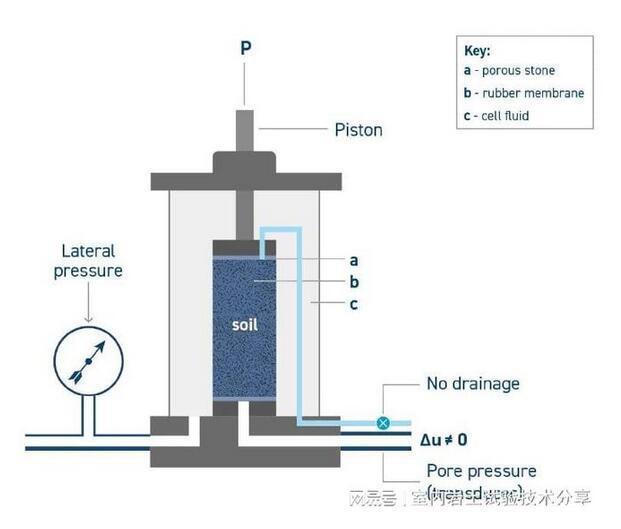 這里以有效應(yīng)力來(lái)衡量剪切強(qiáng)度。試樣飽和并允許在所需的約束壓力下進(jìn)行固結(jié)(土壤固結(jié)是改變其結(jié)構(gòu)和含水量的過(guò)程)。一旦固結(jié),試樣就被施加了一定的荷載,在此期間不允許排水,以便測(cè)量孔隙壓力。