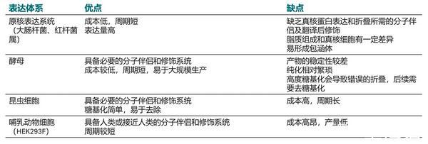 膜蛋白的表達系統(tǒng):原核表達(大腸桿菌、紅桿菌屬)、哺乳細胞(HEK293F)、酵母表達、昆蟲細胞表達。不同的表達系統(tǒng)的優(yōu)缺點見下圖。