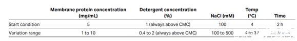 當篩選去垢劑時,要注意每個去垢劑的臨界膠束濃度(CMC)。CMC是指自由的去垢劑分子形成膠束結(jié)構(gòu)需要的濃度。因為溶液相當于膜蛋白從細胞膜上去除進入去垢劑膠束,所以CMC是蛋白提取所需的最低濃度。CMC值可參考表二。