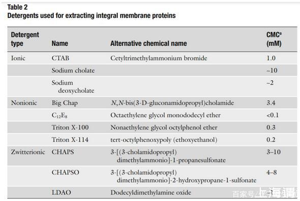 去垢劑的選擇:去垢劑別名表面活性劑、乳化劑、肥皂等等,分為離子型、非離子型和兩性離子型三類。去垢劑是同時具有親水性和疏水性基團的雙極性分子,能夠使磷脂雙分子層解體并釋放膜蛋白,并且為去膜狀態(tài)下的膜蛋白提供穩(wěn)定的疏水環(huán)境。去垢劑也需要篩選合適的種類和濃度,各自優(yōu)缺點見下圖。