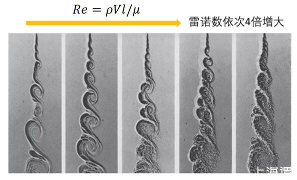 隨著雷諾實(shí)驗(yàn)和雷諾數(shù)被提出來以后,近代流體力學(xué),尤其是湍流理論的發(fā)展出現(xiàn)了一個(gè)前所未有的盛況,而粘性與湍流的關(guān)系也順理成章的轉(zhuǎn)化成了雷諾數(shù)和湍流的關(guān)系。1974年刊登于《流體力學(xué)》期刊中的一篇經(jīng)典文章,通過流動(dòng)顯示技術(shù)生動(dòng)形象的描繪了雷諾數(shù)和流態(tài)的關(guān)系:隨著雷諾數(shù)的增大,渦旋的整體形狀和尺度基本一致,然而射流摻混的渦系結(jié)構(gòu)卻越來越豐富。