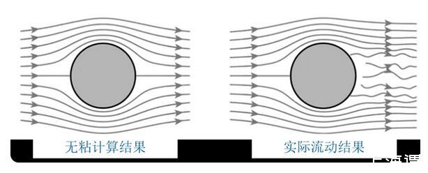 歐拉提出歐拉方程后不久,人們就認(rèn)識到方程中缺乏粘性項(xiàng),這會導(dǎo)致歐拉方程的計(jì)算結(jié)果和實(shí)際產(chǎn)生偏差,比如大家熟知的達(dá)朗貝爾佯謬。下圖顯示了理想流體和實(shí)際流體下圓柱繞流的對比,可以看出,無粘流動(dòng)的結(jié)果和實(shí)際存在很大的差異。因此,如何在流動(dòng)方程中添加粘性項(xiàng)成為了跨越百年的流體力學(xué)難題。