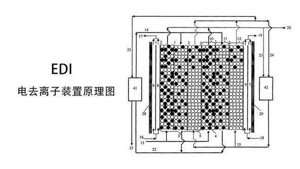 EDI進(jìn)水中的陽(yáng)離子和陰離子跟離子交換樹(shù)脂中的氫離子和氫氧根離子交換,形成超純水(高純水)。超極限電流使水電解產(chǎn)生的大量氫離子和氫氧根離子對(duì)離子交換樹(shù)脂進(jìn)行連續(xù)的再生,可以連續(xù)工作,不需要酸堿化學(xué)再生。
