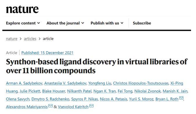 2021年12月15日,美國(guó)南加州大學(xué)、東北大學(xué)和北卡羅來納大學(xué)教堂山分校的研究團(tuán)隊(duì)合作,在Nature發(fā)表了題為:Synthon-based ligand discovery in virtual libraries of over 11 billion compounds的研究論文。