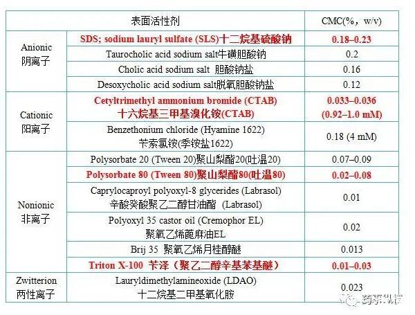 如果上述條件都不合適,可以考慮采用加入表面活性劑,此時應(yīng)查詢國內(nèi)外文獻、專利、質(zhì)量標(biāo)準(zhǔn),并結(jié)合藥物結(jié)構(gòu)選擇表面活性劑的種類。篩選時,應(yīng)根據(jù)情況考慮涵蓋所有常用種類的表面活性劑,比如陰離子型、陽離子型、和非離子型。USP中列舉了多種商品化的表面活性劑及其臨界膠束濃度(Critical Micelle Concentration,CMC)的近似臨界值,在方法開發(fā)中可以參考。