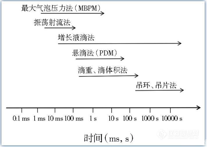 由于對DST時(shí)間范圍界定的不同,可運(yùn)用的測量手段也有所不同。王建坤等認(rèn)為,在達(dá)到靜態(tài)表面張力前的表面張力變化都可算是DST,這個(gè)時(shí)間范圍以幾毫秒到幾小時(shí)計(jì)??捎肳ilhelmy吊片法、DuNouy吊環(huán)法、滴重法、滴體積法、懸滴法、最大氣泡壓力法測定DST。