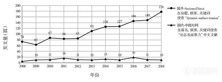 當(dāng)研究的液體吸附過程在快速、持續(xù)進(jìn)行,且短時(shí)間內(nèi)無法達(dá)到平衡時(shí),對液體DST的研究比靜態(tài)表面張力更有意義。如在農(nóng)藥噴灑、噴墨印刷、織物快速潤濕,以及攝影用薄膠片制備中。圖1對比了近10年(2008~2018年)國內(nèi)外發(fā)表的以DST為主要考察項(xiàng)的論文數(shù)。數(shù)據(jù)顯示國內(nèi)在DST方面的研究較少且總體波動(dòng)不大,而國外則呈持續(xù)上升趨勢。