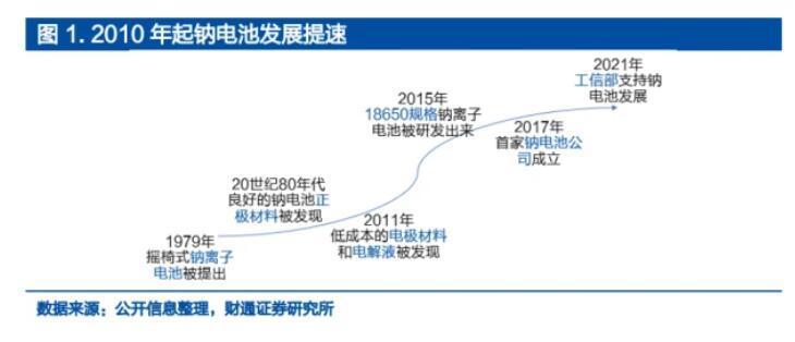 鈉電池隨著產(chǎn)業(yè)化加速,量產(chǎn)在即。1979年法國(guó)的Armand提出了“搖椅式電池”的概念,開始鈉離子電池的研究。隨后Delmas和Goodenough發(fā)現(xiàn)了層狀氧化物材料可作為鈉電池正極材料,Stevens和Dahn發(fā)現(xiàn)硬碳材料作為負(fù)極有良好的鈉離子嵌脫性能。2010年以來(lái),鈉電池的研發(fā)進(jìn)程加速。2011年中科院物理所研究員團(tuán)隊(duì)開始了鈉離子電池核心技術(shù)的研發(fā),自此以后開發(fā)出低成本的電極材料。2017年國(guó)內(nèi)第一家專注于鈉離子電池研發(fā)和生產(chǎn)的公司中科海鈉成立。2021年寧德時(shí)代成功舉行了第一代鈉離子電池線上發(fā)布會(huì)。2022年,中科海納和傳藝科技均預(yù)計(jì)2023年量產(chǎn)其鈉離子電池。