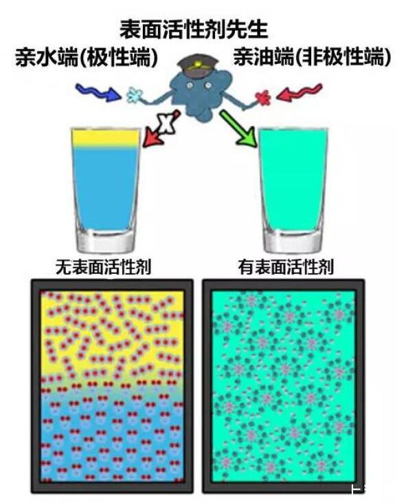 表面活性劑(surfactant)指的是一類(lèi)能夠降低液體表面張力的化合物,是一種“兩親”分子,既能和水分子親熱,也能和油分子親熱。
